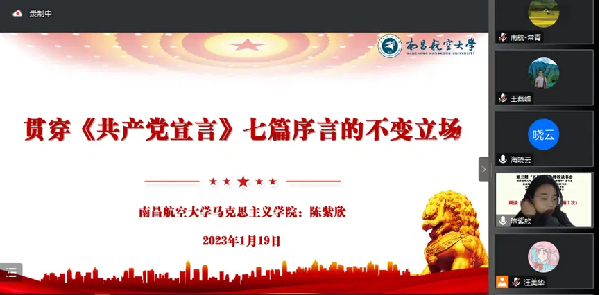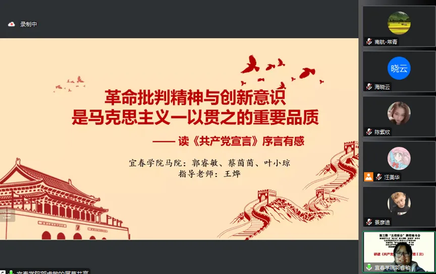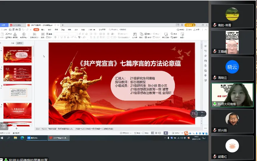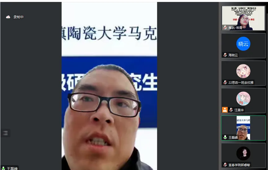 宜春学院王烨老师指出五位同学对七篇序言进行了深入的学习、阅读、理解,对五位同学的分享内容进行了总结并表达了自己的感受。他说:“我们同学需要深入读原文文本,这样才能零距离亲近马克思,不能纯粹去找参考文献,要更好学习宣言内容,序言三万多字值得我们每一个马克思主义理论专业的同学反复读,读懂宣言的理论和现实意义,我们要防止历史虚无主义和马克思主义过时论的错误观点,要铭记和坚持马克思主义理论的基本原理,坚持我们的初心使命。”