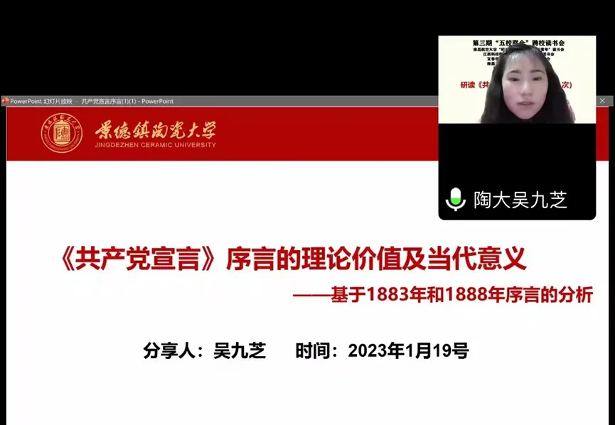 同学们分享结束后,五位指导老师对同学们的分享进行了精彩的点评指导。首先景德镇陶瓷大学王磊峰老师指出,五位同学对《共产党宣言》的方法、原理、内容和当代意义都有比较好的阐述。此次读书会分享,帮助大家深化了对《共产党宣言》的理解。同时他提出,在学习过程中,要坚持懂和通统一,贯通七篇序言的内容和精神;要有言和信的统一,坚定马克思主义没有过时;要有知和行的统一,弄懂一篇序言,也要了解七篇序言的关联,要了解其中的方法论,学习过程中要做到知信行统一。