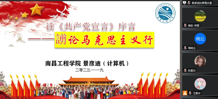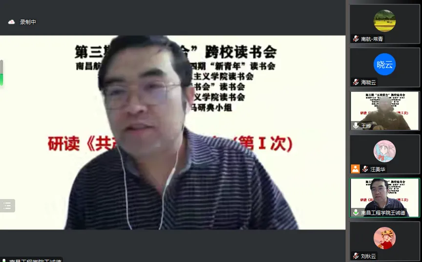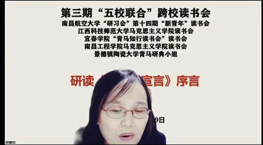这次五校跨校读书会,激发了同学们研读经典的热情,同学们每次读《共产党宣言》序言都如新风扑面。最强烈的感觉是不回避、不啰嗦、不绕弯,无废话、无空话、无假话,直击要害,革故鼎新。《共产党宣言》第一次完整而深刻地阐述了马克思主义及其科学社会主义的基本思想、基本原理和基本宗旨。习近平总书记指出,从《共产党宣言》发表到今天,170年过去了,人类社会发生了翻天覆地的变化,但马克思主义所阐述的一般原理整个来说仍然是完全正确的。今天重读《共产党宣言》,我们更加深刻地感悟到马克思主义真理精神,更加坚定了马克思主义信仰和共产主义必胜信念,增强了学习贯彻习近平新时代中国特色社会主义思想的思想自觉,增强了实现“两个一百年”奋斗目标的行动自觉!