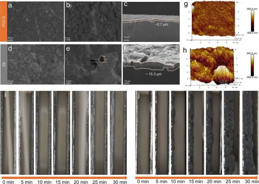 不同电解液条件下,在 5 mA cm−2和 0.5 mAh cm−2下循环 50 次后锌负极表面的 SEM 图像。FDZ15 组的 (a,b) 俯视图和 (c) 横截面图;ZS 组的 (d,e) 俯视图和 (f) 横截面图。在不同电解液中浸泡 7 天后电极表面的 AFM 测试结果:(g) FDZ15 组,(h) ZS 组。在 (i) FDZ15 和 (j) ZS 电解液中,10 mA cm−2条件下锌沉积行为的原位光学显微镜图像。