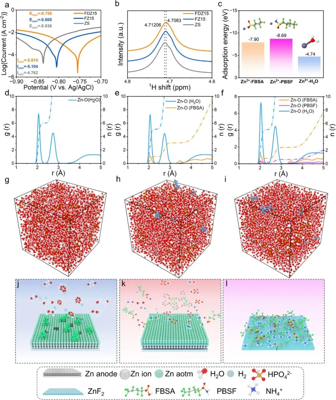 (a) 不同电解液中锌负极的塔菲尔曲线。(b) 1H NMR谱图。(c) H2O/FBSA/PBSF与Zn2+的结合能。不同电解液中Zn2+–O(添加剂)、Zn2+–O(H2O)的径向分布函数及配位数:(d) ZS、(e) FZ15、(f) FDZ15。不同电解液体系分子动力学模拟得到的快照:(g) ZS、(h) FZ15、(i) FDZ15。不同电解液体系中,AZIBs循环过程中电极/电解液界面特性的演变:(j) ZS、(k) FDZ15。(l) FDZ15组SEI层的放大视图。