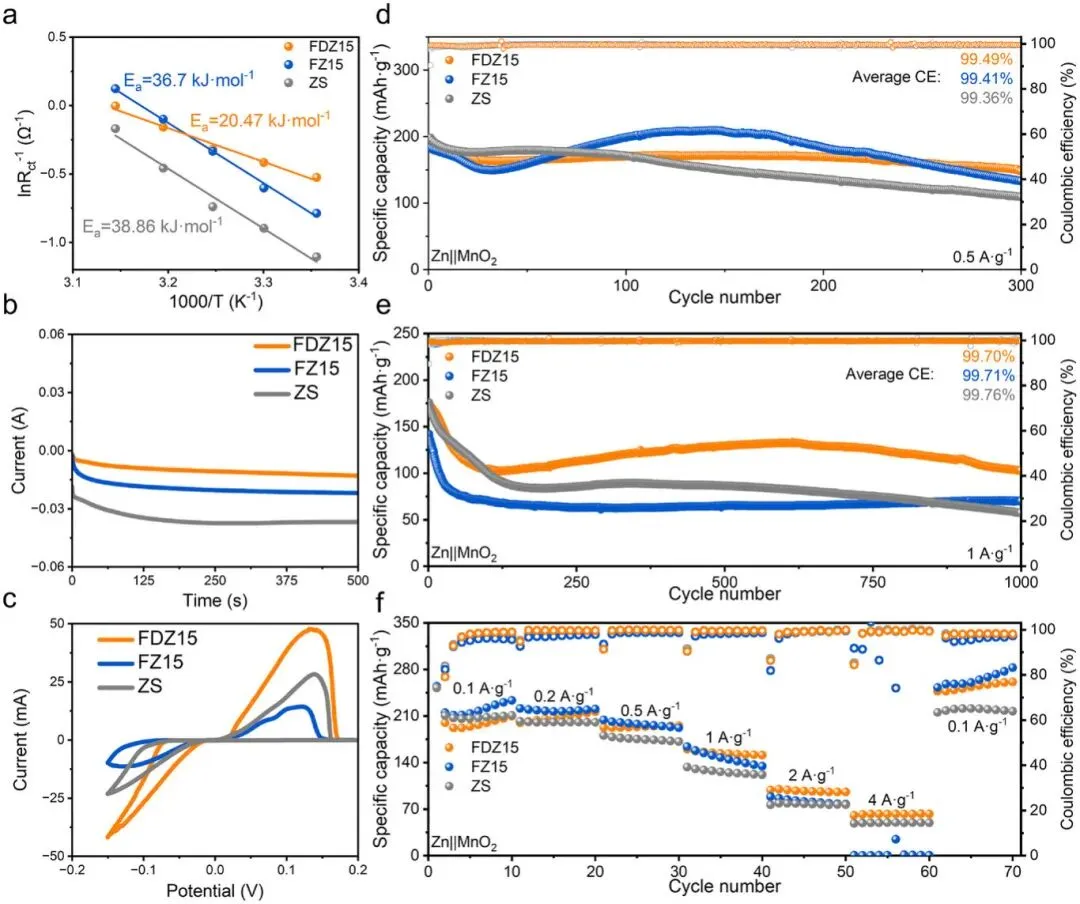 (a) 25℃ 至 45℃ 范围内电荷转移电阻倒数(Rct−1)的阿伦尼乌斯图。(b) 在−0.15 V vs. Zn2+/Zn条件下的计时安培曲线。(c) Zn||Cu 的 CV 测试。Zn||MnO2 全电池在 (d) 0.5 A g−1和 (e) 1 Ag−1下的长循环性能。(f) Zn||MnO2 全电池在 0.1 至 4 A g−1电流密度下的倍率性能。