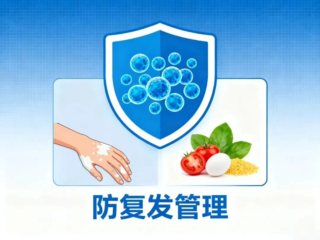 饮食和生活习惯的调整,也是黄金关键期抗复发的重要环节。日常饮食中,可适当多摄入富含酪氨酸、铜、锌等营养素的食物,这些营养素是黑色素合成的重要原料,有助于色素细胞的修复,比如瘦肉、蛋类、动物肝脏、豆类、坚果、新鲜蔬菜和水果等。同时,要避免长期食用辛辣刺激性食物、海鲜等易诱发过敏的食物,戒烟限酒,减少对身体的刺激。生活中要保持规律作息,避免熬夜,保证充足的睡眠,有助于免疫系统的稳定;保持良好的心态,避免长期焦虑、紧张、抑郁等不良情绪,因为情绪波动也可能影响内分泌和免疫系统,增加复发风险,可通过运动、听音乐、与人交流等方式调节情绪。