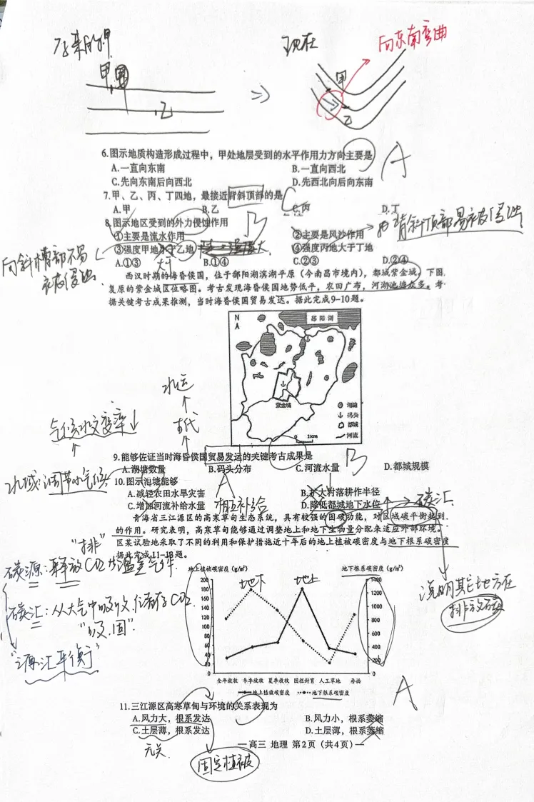 第6-8题,考察地质与古地层学的知识,我认为这道题放在这个位置会难住相当一部分中等水平的考生,放弃又不甘心,不放弃又没有思路,导致整张试卷后面大题部分没有充足时间写。第6题我认为是选择题中难度最大的一道题,需要化抽象为具体进行转化;第7题需要结合提示的三叠纪与侏罗纪底层的早晚,转化为岩层的新老关系,再利用课本中的“背斜中间老两侧新”来做,思维量比较大;如果前两个小题拿下以后第9题反而比较容易了,实质就是一个地形倒置的问题。