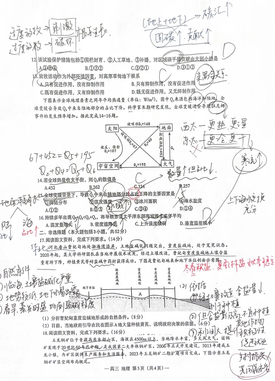 第14-16题,这组题也出得不错,考察了海——气耦合,第15题难度大,要想到“占比≠数量”这一层意思,最后传导到“水域面积增加”上来。第16题一个常规沃克环流,最后传导到“秘鲁上升流加强”。上课认真听讲的同学就有分,这种题只要听了就一定能写对,别无技巧。
