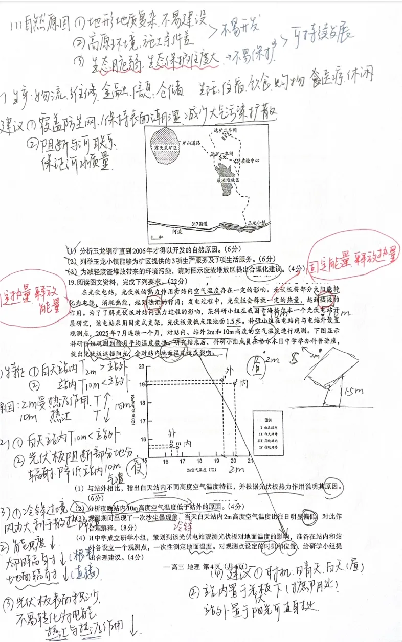 第19题,听说是有蛮多学生没有时间写这道题的,这道题的概念给得很新颖,热汇和热源可以类比碳汇和碳源。第一问看图说话,出得挺不错,该有的都有了;第二问我觉得命得一般,答案给得也一般;第三问要明确沙尘暴实质是冷锋过境,再结合天气系统的特点就比较好答;第四问常规吧,中规中矩一个实验性探究问题,无功无过。