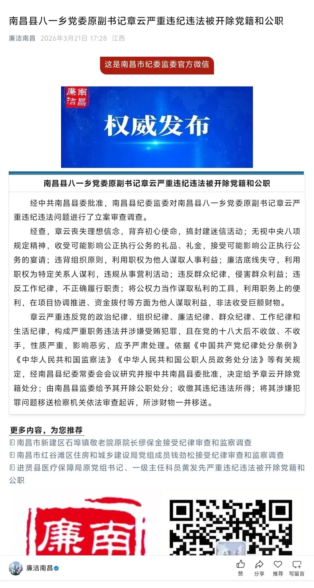 《江西省南昌县八一乡党委原副书记章云严重违纪违法被开除党籍和公职》