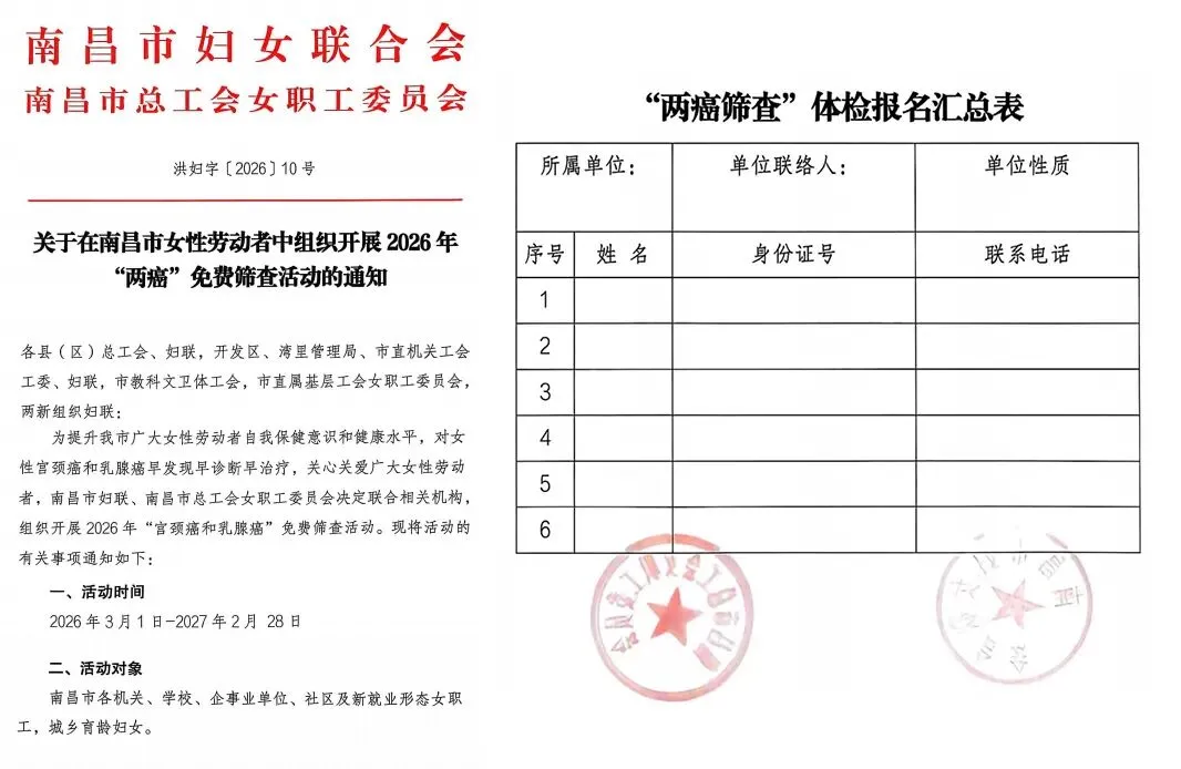 此次免费筛查活动,是南昌市妇女联合会、南昌市总工会女职工委员会联合各县(区)妇联、总工会推出的民生福利,初衷就是提升广大女性劳动者的自我保健意识,实现宫颈癌、乳腺癌的早发现、早诊断、早治疗,切实把关爱女性健康的举措落到实处。