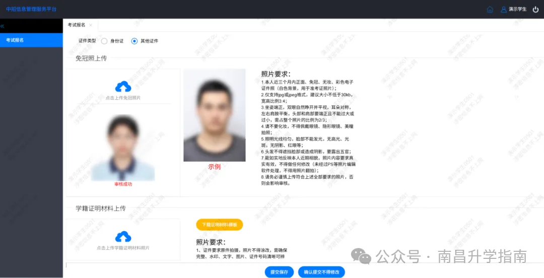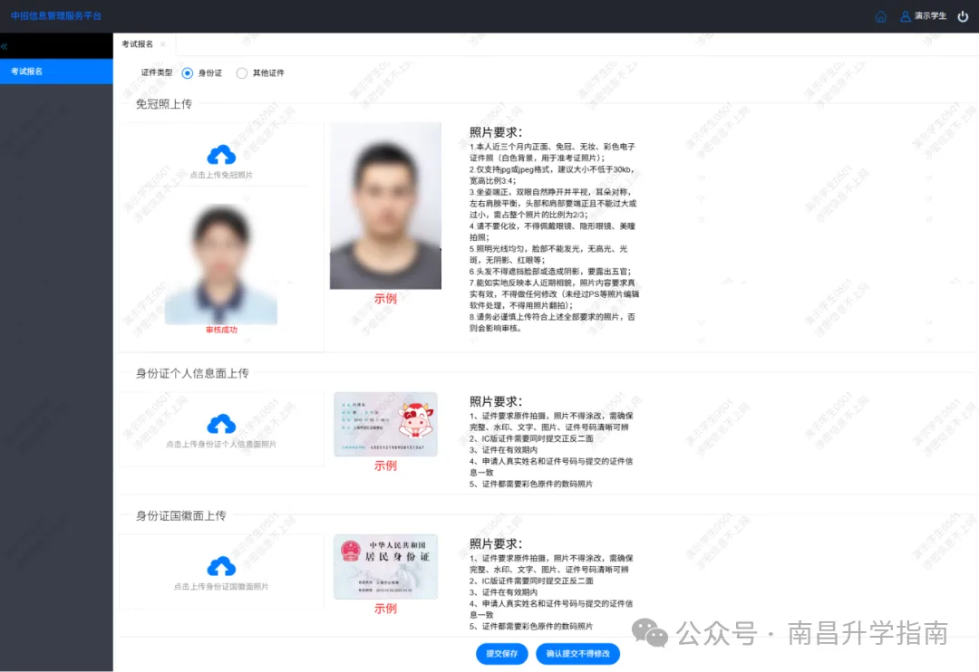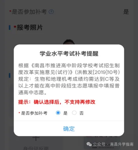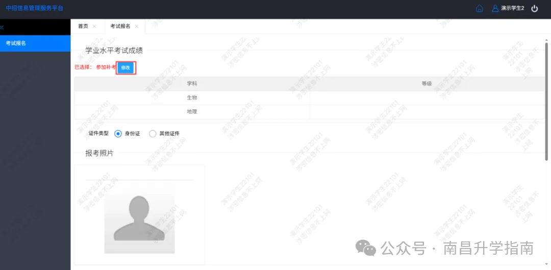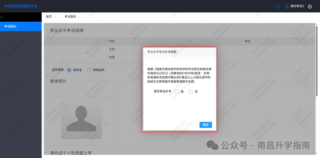 报名信息提交后,系统会跳转到报名信息记录页,学生可查看报名状态。如下图所示:针对生物、地理有一门或者两门成绩为D的学生,系统弹出补考提示,学生可选择是/否参加补考。1、考试照片上传