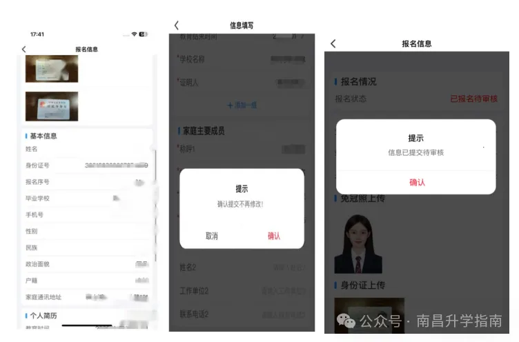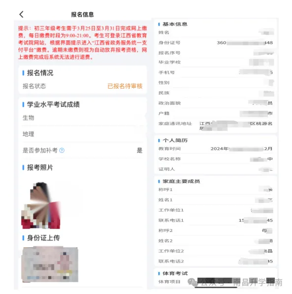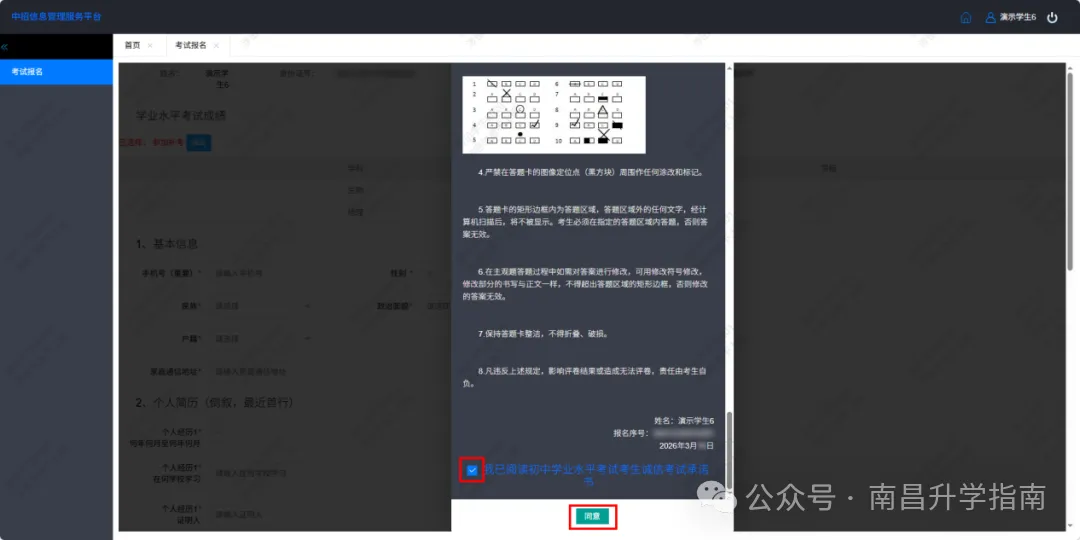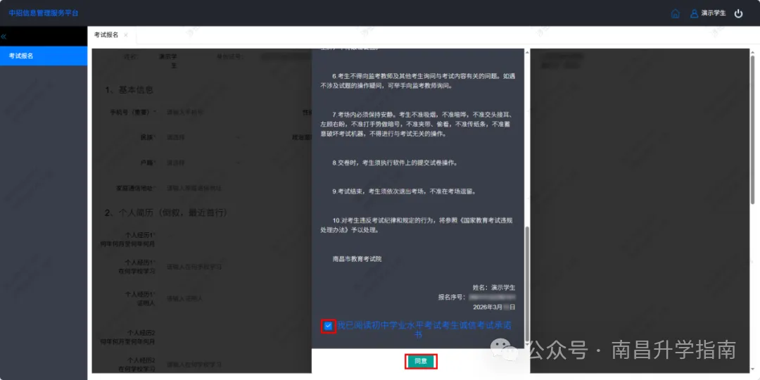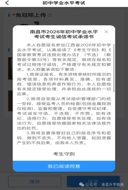 学生阅读《南昌市2026年初中学业水平考试考生诚信考试承诺书》,点击“我已阅读同意”。3、报名信息填写