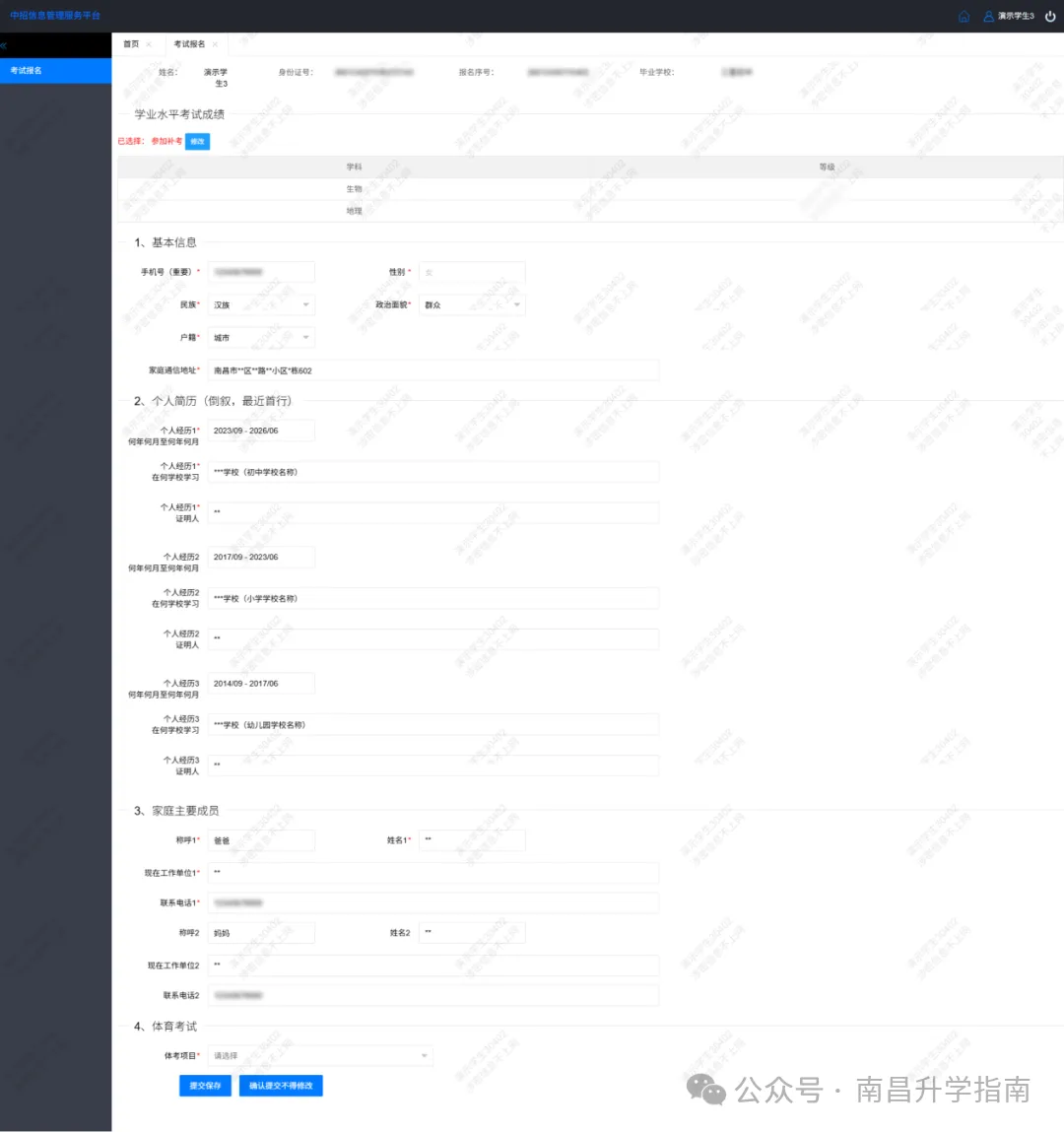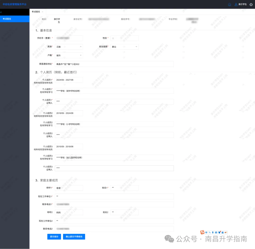 填写基本信息、个人简历、家庭主要成员(必须填写监护人,联系电话必须填写监护人准确的常用手机号码)等信息。备注:“个人简历”需按初中、小学、幼儿园顺序填写,必须要有初中和小学两段学习经历。