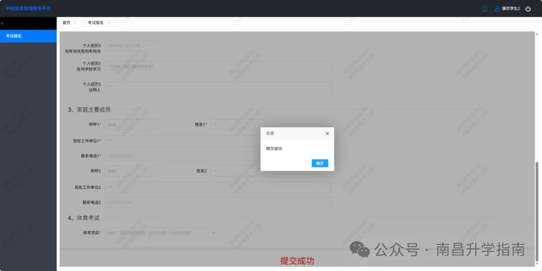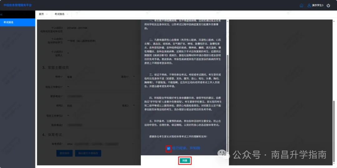 点击“保存”并阅读《南昌市2026年初中毕业生升学考体育考试安全告知书》。如下图所示:5、报名信息提交