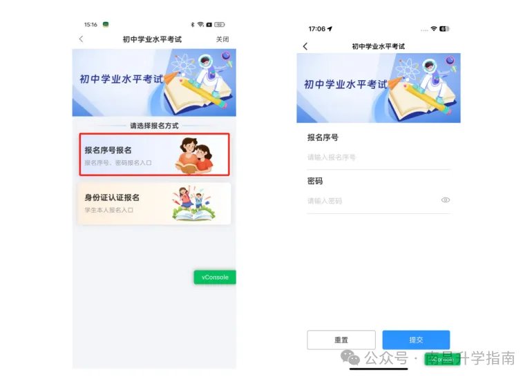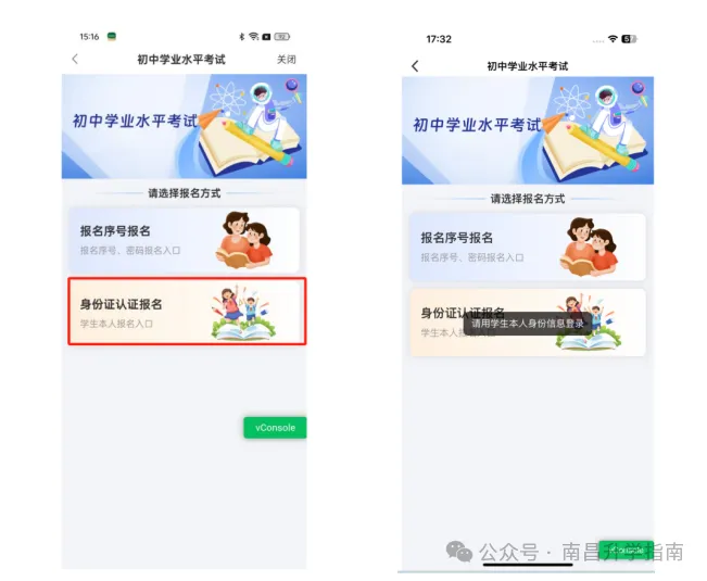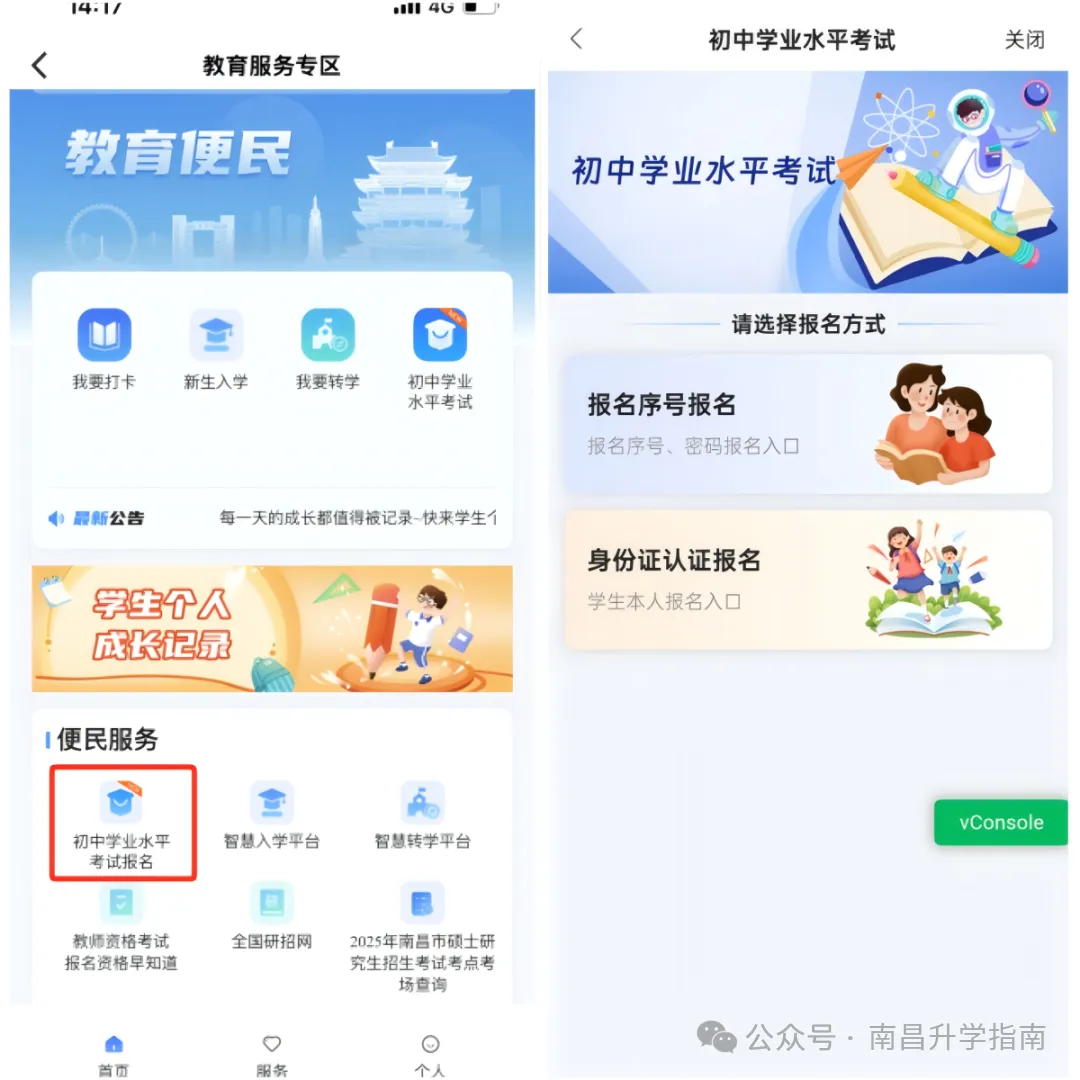 2026年南昌市初中学业水平考试报名移动端操作说明通过“昌通码”APP或微信“昌通码”小程序进入昌通码首页,选择教育服务专区,选择“初中学业水平考试报名”,进入报名首页。报名方式有两种:报名序号报名(推荐使用)和身份证认证报名。如下图所示:注意事项: