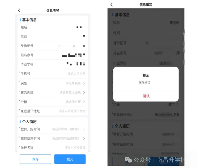 填写基本信息、个人简历、家庭主要成员(必须填写监护人,联系电话必须填写监护人准确的常用手机号码)等信息,点击“提交保存”。