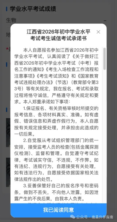 学生阅读《南昌市2026年初中学业水平考试考生诚信考试承诺书》,并勾选“我已阅读初中学业水平考试承诺书”,点击“同意”。
