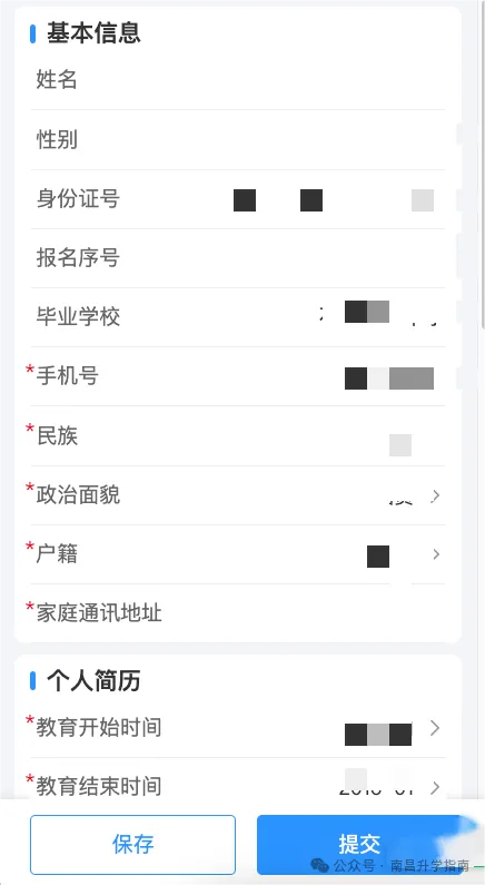 填写基本信息、个人简历、家庭主要成员(必须填写监护人,联系电话必须填写监护人准确的常用手机号码)等信息,点击“保存”。如下图所示:备注:“个人简历”需按初中、小学、幼儿园顺序填写,必须要有初中和小学两段学习经历。