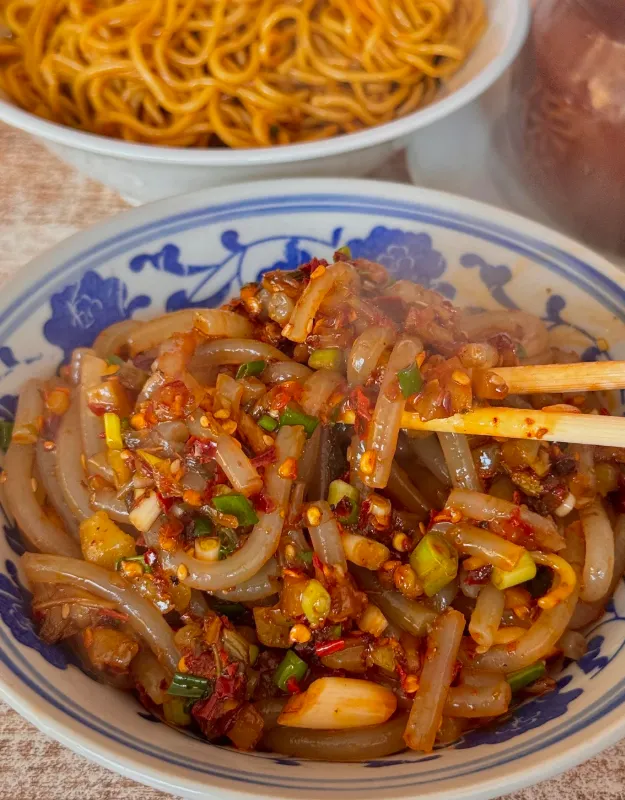 我最常点的是冷粉。做法不复杂,米浆蒸成薄片,切成条,浇上蒜水、酱油、醋,再来一勺辣椒油,撒点葱花和花生碎。关键是那口“凉”和“滑”,先把火气按下去,再让辣味慢慢追上来。