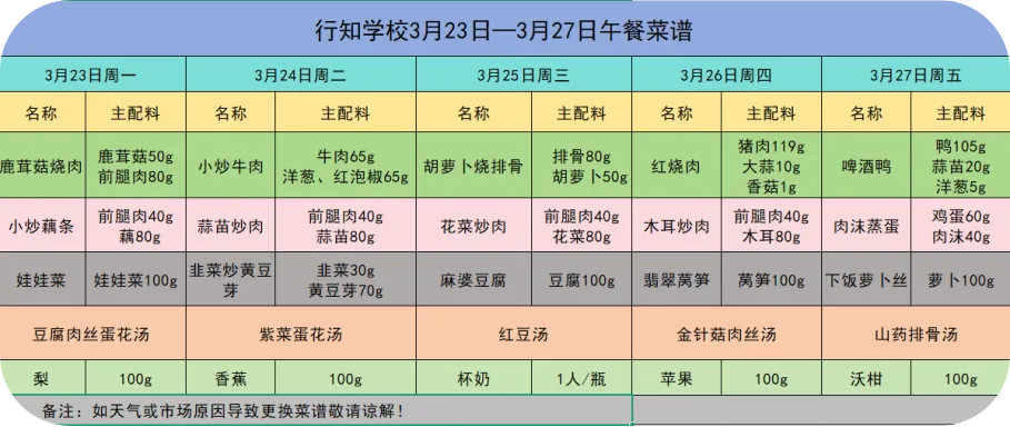 2. 若遇天气突变、市场供应波动等特殊情况,食谱将临时调整,敬请谅解,学校会第一时间公示调整内容。
