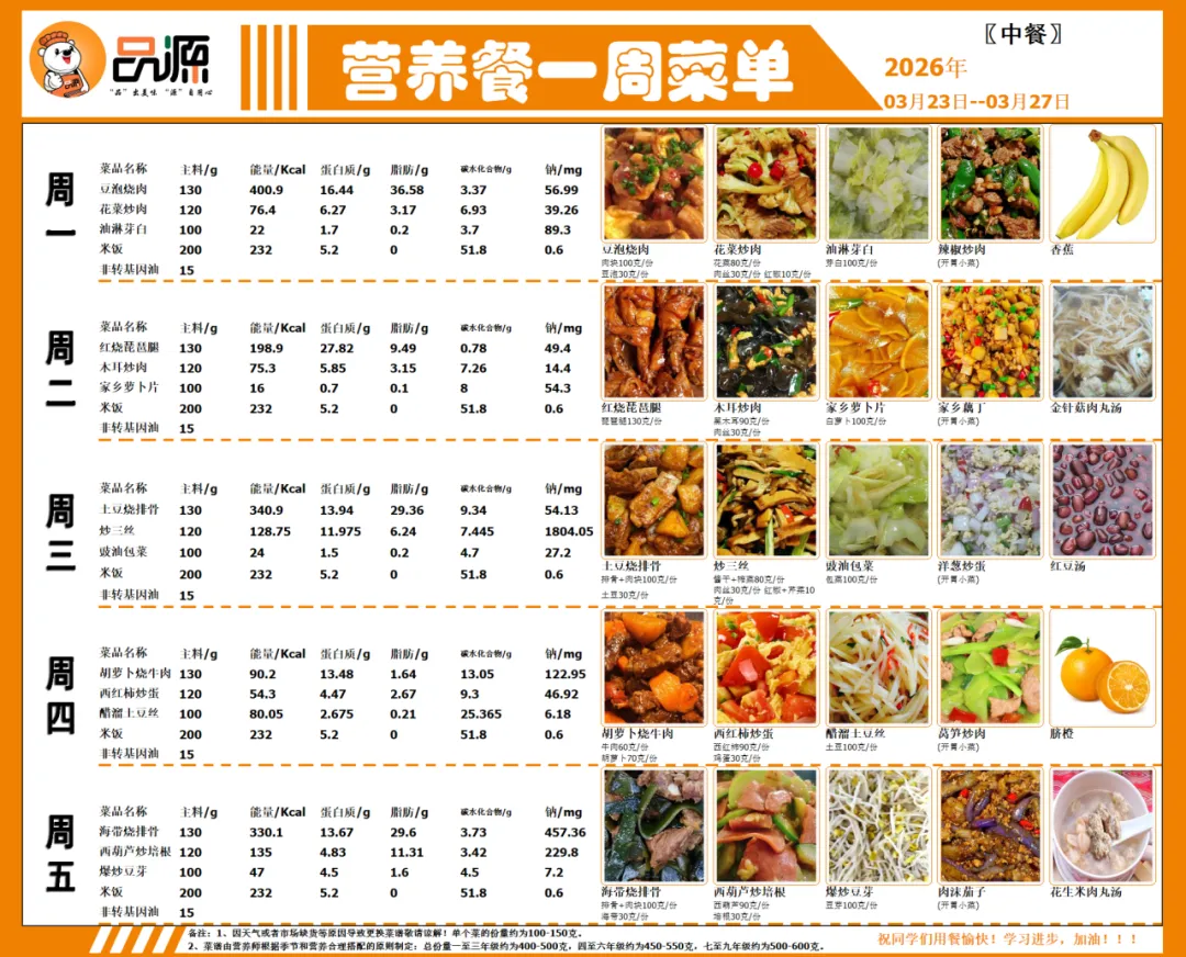 健康饮食是我们全体师生们成长的基础。本周菜单已准时更新,从荤素搭配到口味调剂,都围绕这份“健康”精心安排,一起来看看吧!
