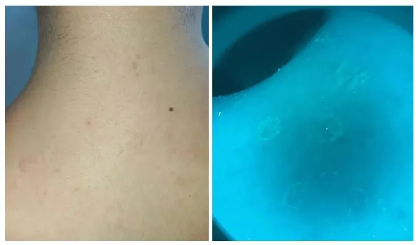 2. 鳞屑覆盖:有色素改变的皮肤表面通常会覆盖有细小、糠秕状的鳞屑,容易脱落,是马拉色菌侵犯皮肤角质层导致角质层代谢异常的表现。