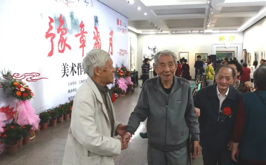 2015年罗会刚(左二)在南昌《豫章岁月》画展与漆德琰(左一)、谢天锡(左三)合影