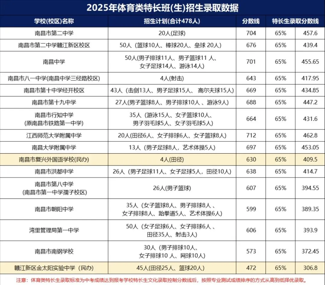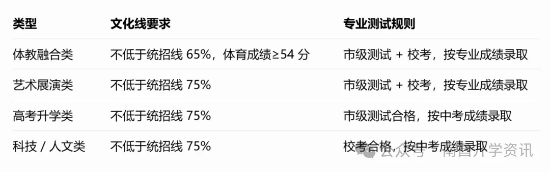 2. 关注学校录取分数线门槛:各学校会在市定最低控制线(非体育类不低于统招线75%,体育类不低于65%)基础上,根据自身情况设定本校分数线。比如洪都中学国防特长生要求文化成绩达到该校统招线的85%,高于市级最低标准。需结合自身文化成绩预估,选择“跳一跳够得着”的学校,避免目标过高或过低。
