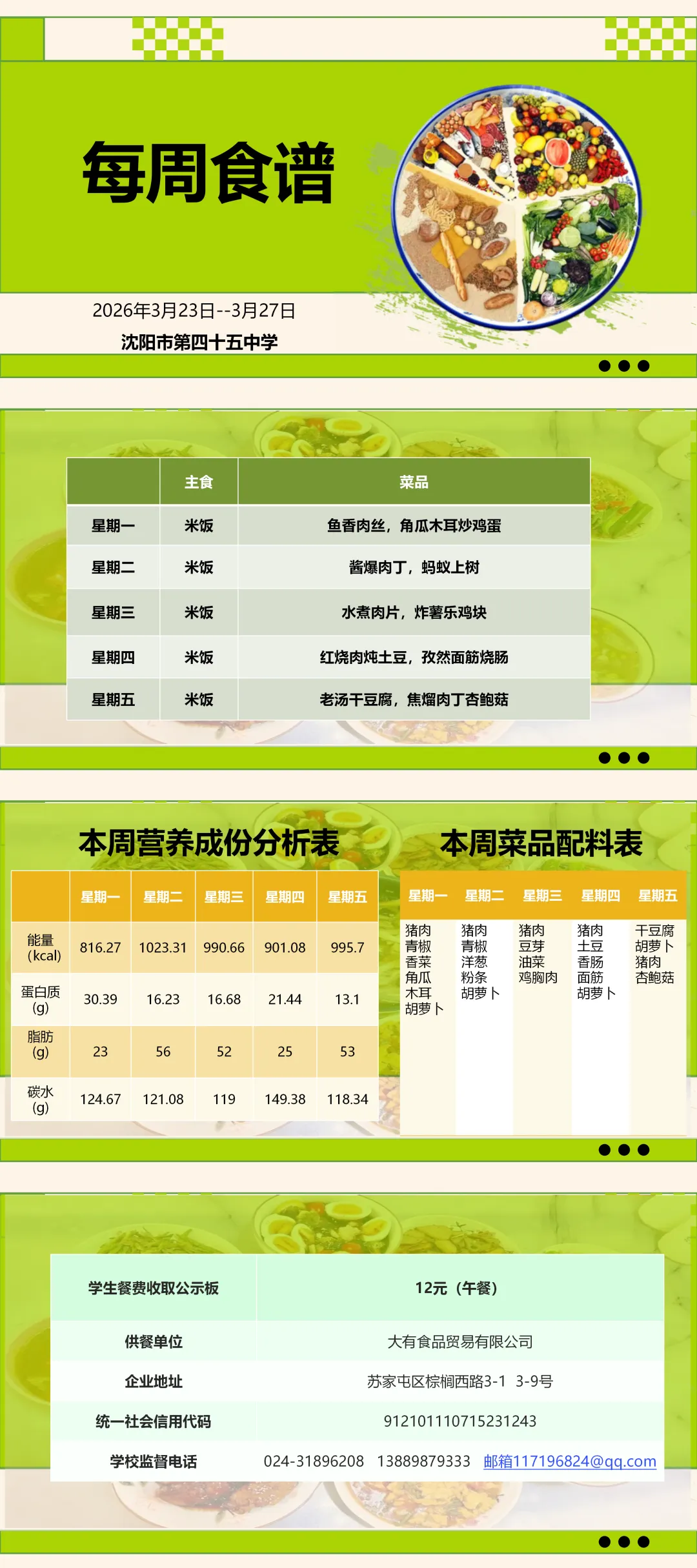 【南昌 满融】沈阳市第四十五中学2026年3月23日-3月27日食谱