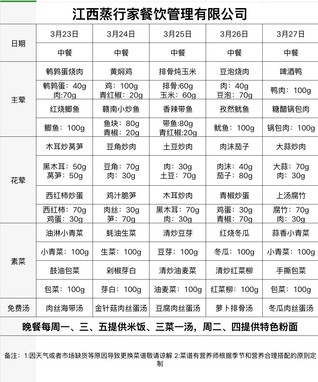 南昌二中丹霞路校区本周校园营养食谱(3月23日-3月27日)