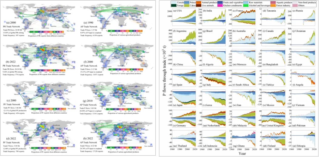 基于1990—2022年国际贸易网络分析(图4),研究发现磷矿、化肥和农产品贸易规模分别增长23%、54%和256%,其中农产品贸易承载的“隐含磷”已占全球农田化肥投入的约25%(2022);北美、南美成为向亚洲和欧洲输出大量“虚拟磷”的主要区域,亚洲和欧洲分别吸纳了全球47%和31%的磷输入,形成新的磷积累与水体富营养化高风险区;目前国际农产品贸易在全球范围内形成了复杂的磷资源再分配和污染足迹传递机制,消费国与生产国在环境责任和政策工具上存在明显脱节。
