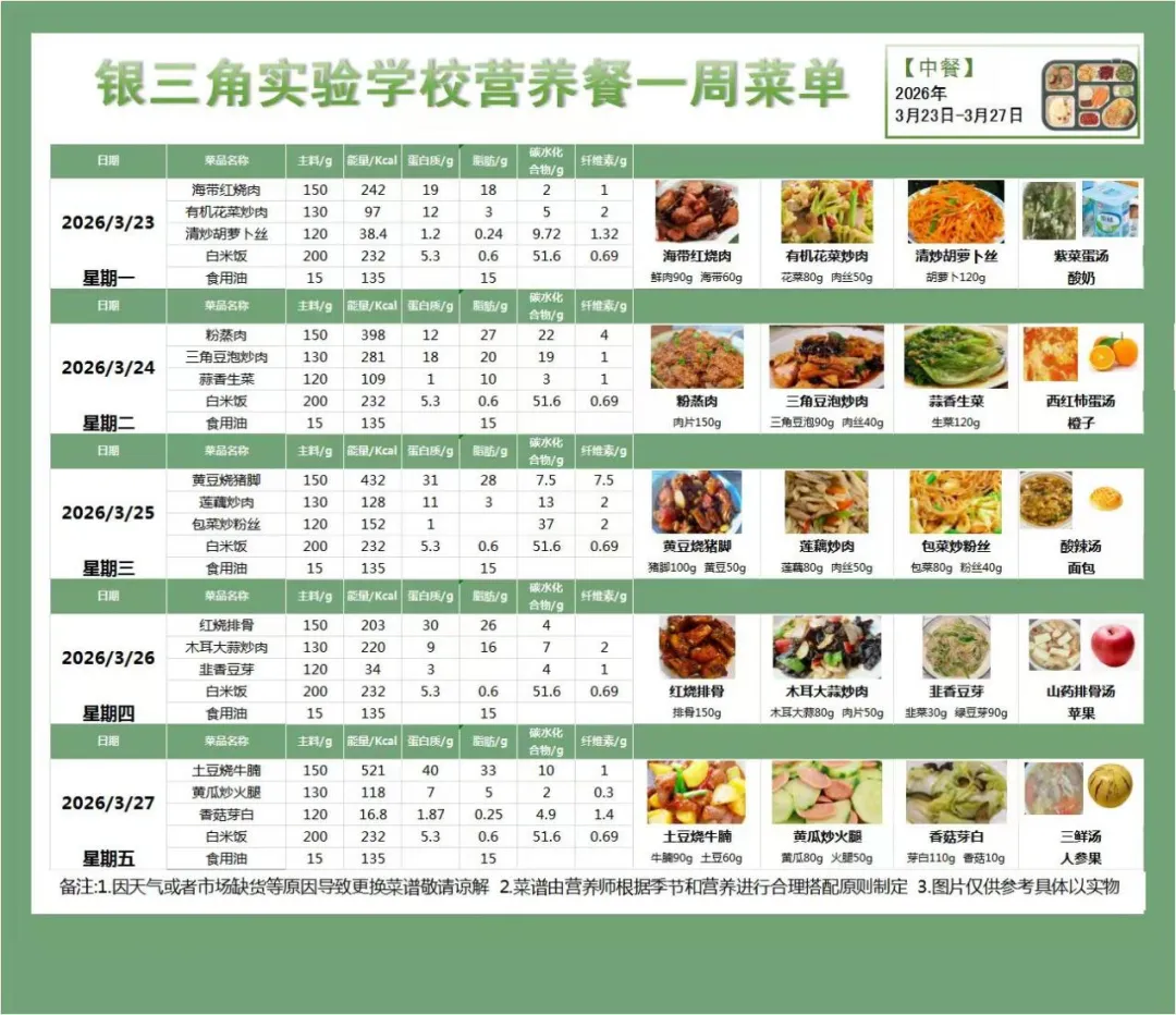 南昌县银三角实验学校一周菜谱公示(3月23日-3月27日)