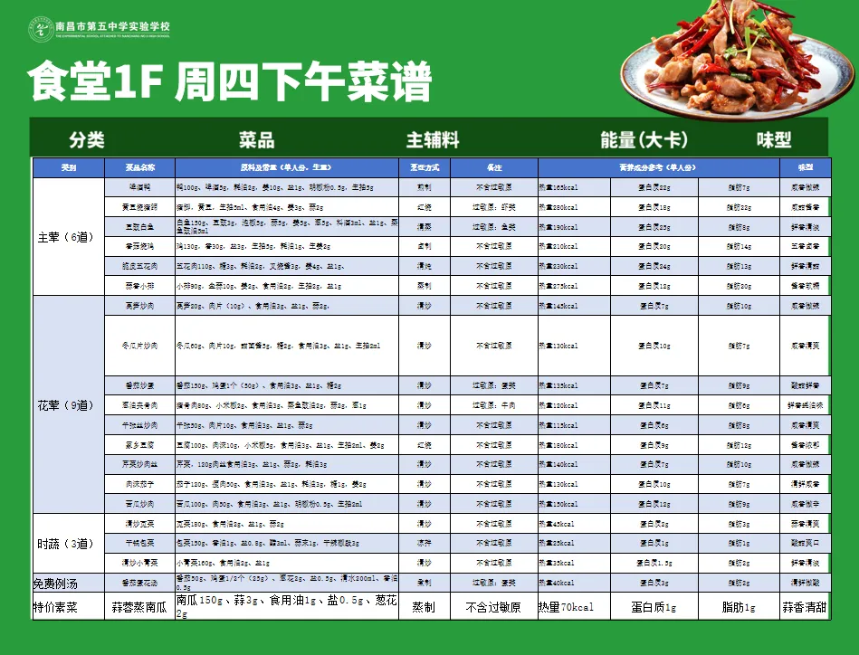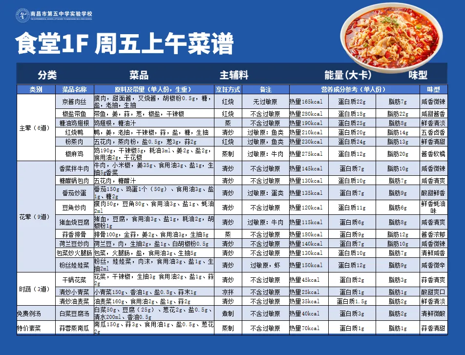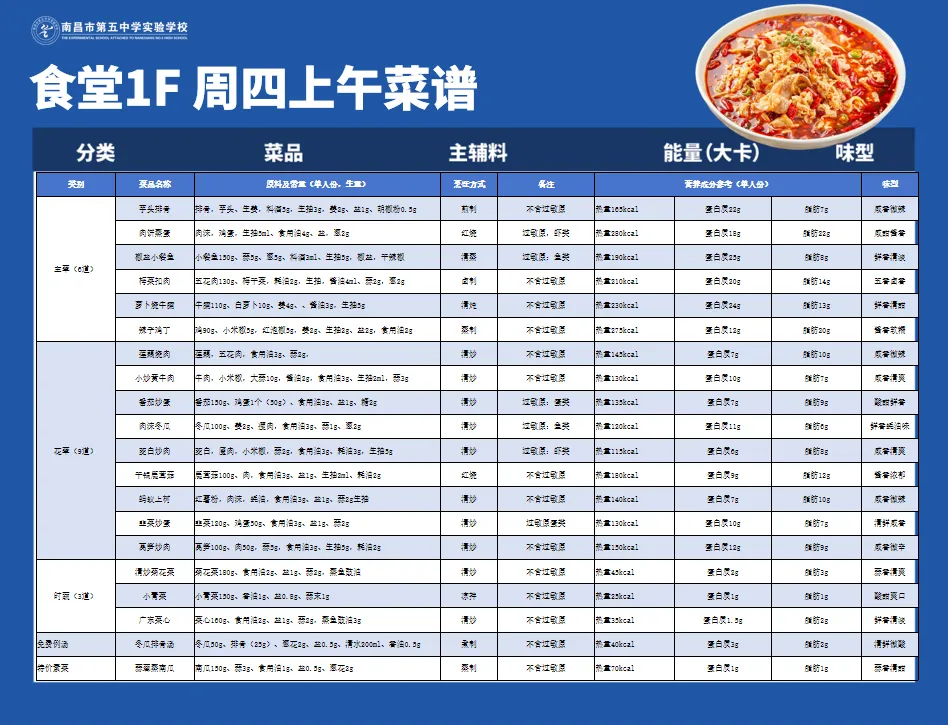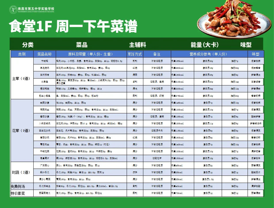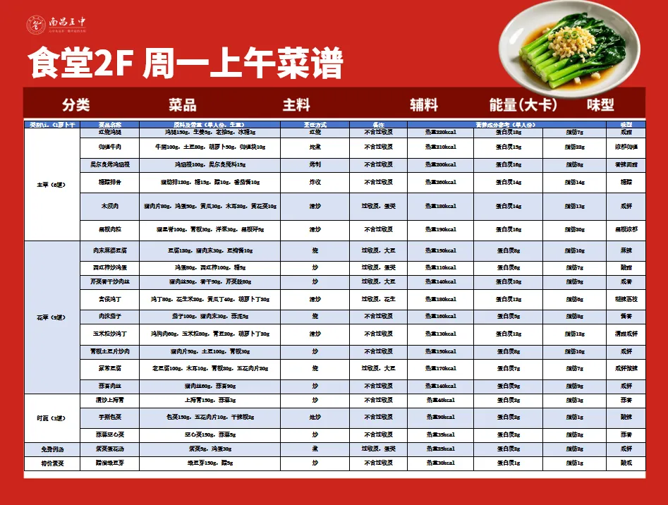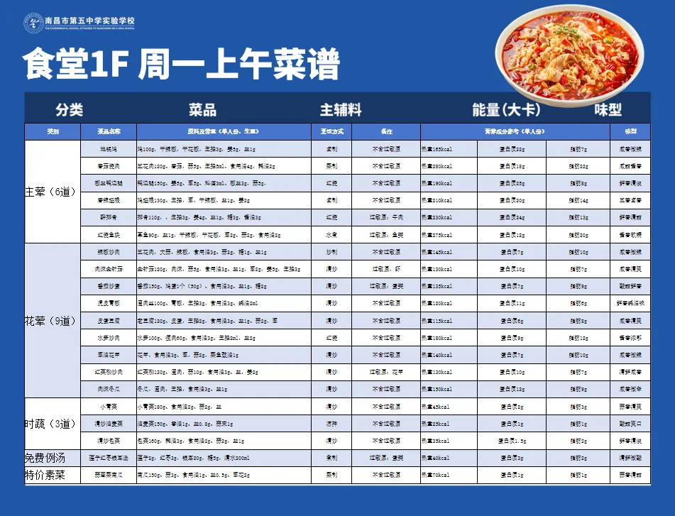 健康的饮食是学生成长的根基,日常的营养膳食是保证学生身心成长的关键基础。为提升师生膳食质量,守护师生“舌尖上的安全”,南昌五中后勤部门精心设计了兼顾营养与风味的美食菜单,多措并举,全方位保障师生享用的餐食安全、营养、美味。