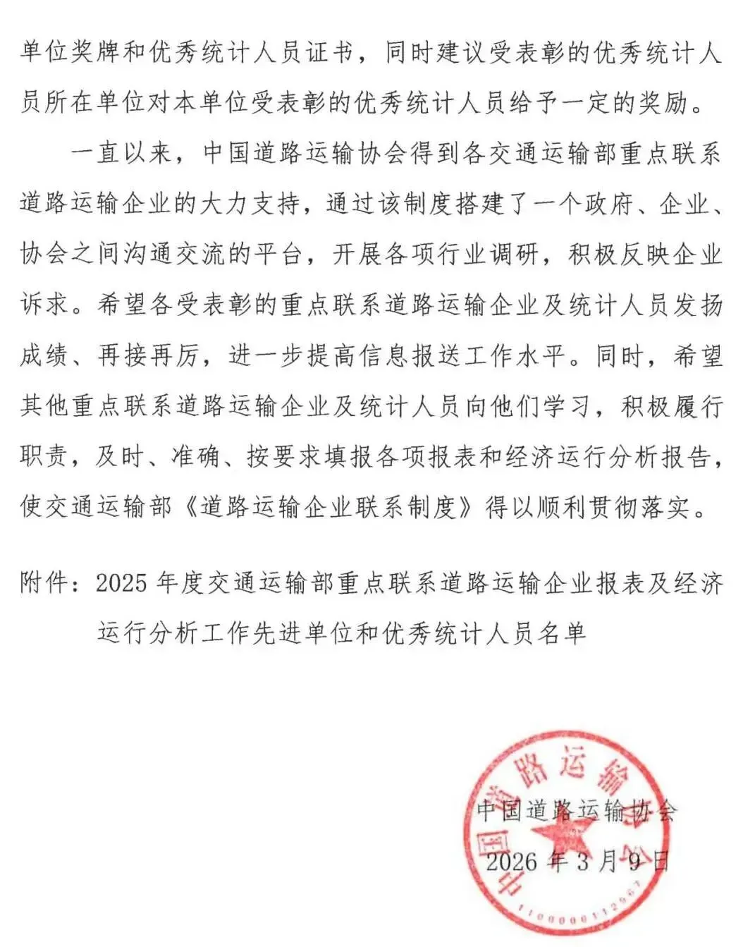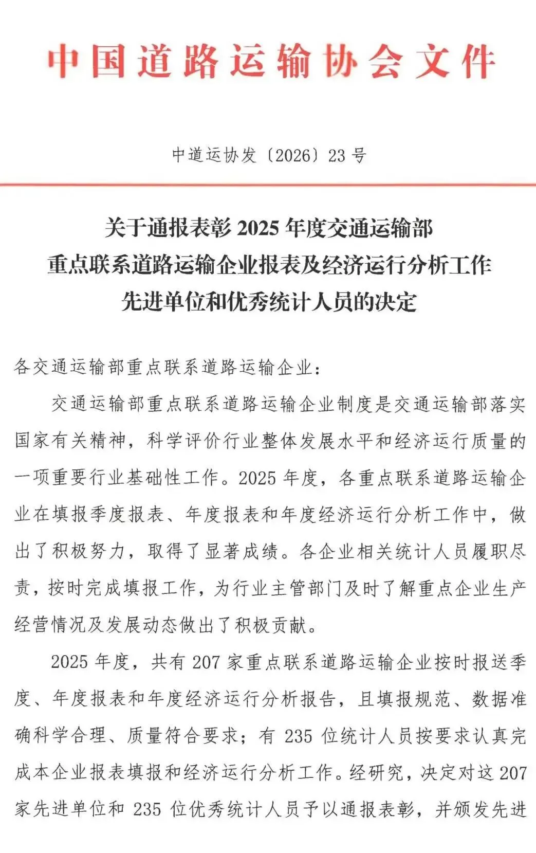 近日,中国道路运输协会发布《关于通报表彰2025年度交通运输部重点联系道路运输企业报表及经济运行分析工作先进单位和优秀统计人员的决定》,其中:
