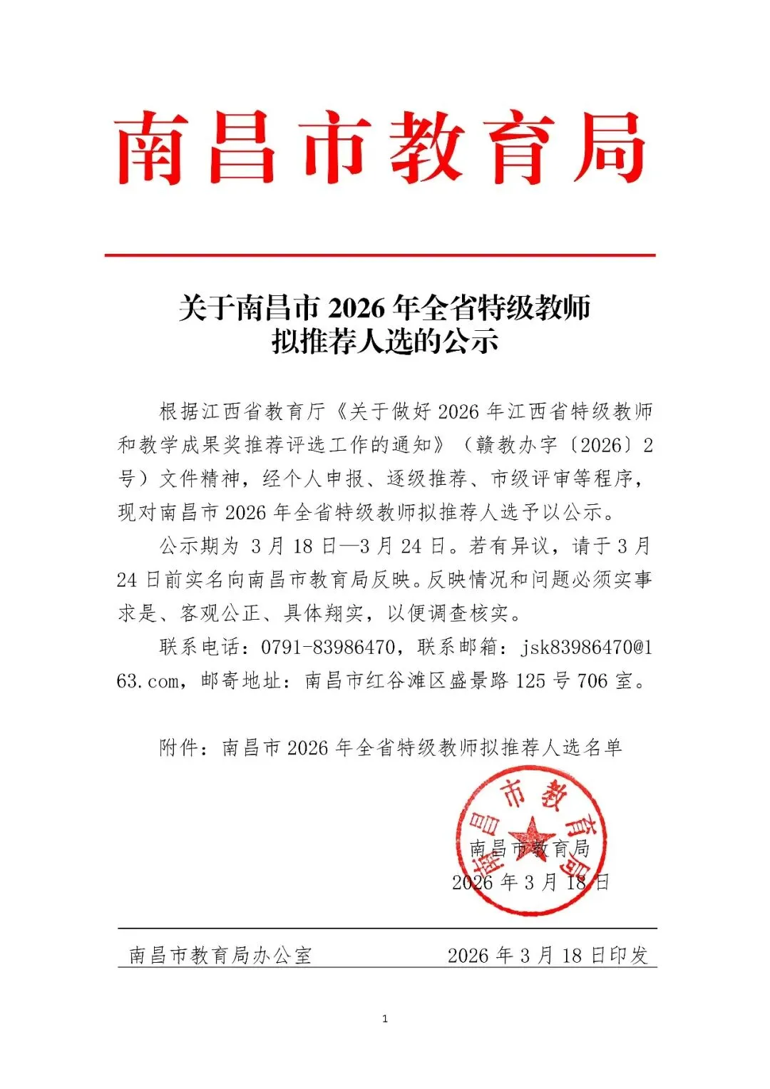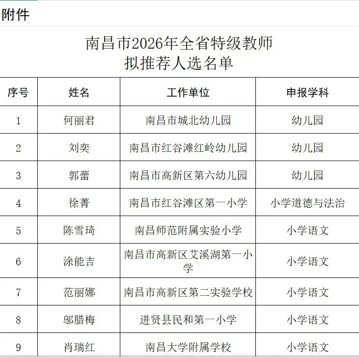 >南昌市2026年全省特级教师推荐人选的公示_