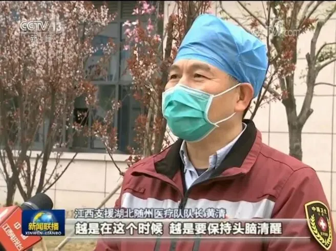 3月15日,中央电视台《新闻联播》报道“19省份对口支援湖北16市州,众志成城汇聚决胜之力”,江西对口支援随州医疗队队长、南昌大学附属人民医院副院长黄清在接受央视记者采访时说道:“习近平总书记在湖北武汉考察疫情防控工作时强调‘越是在这个时候,越是要保持头脑清醒,越是要慎终如始。’我们要一鼓作气,扛得住、守得住,把这场阻击战、攻坚战完成好。”