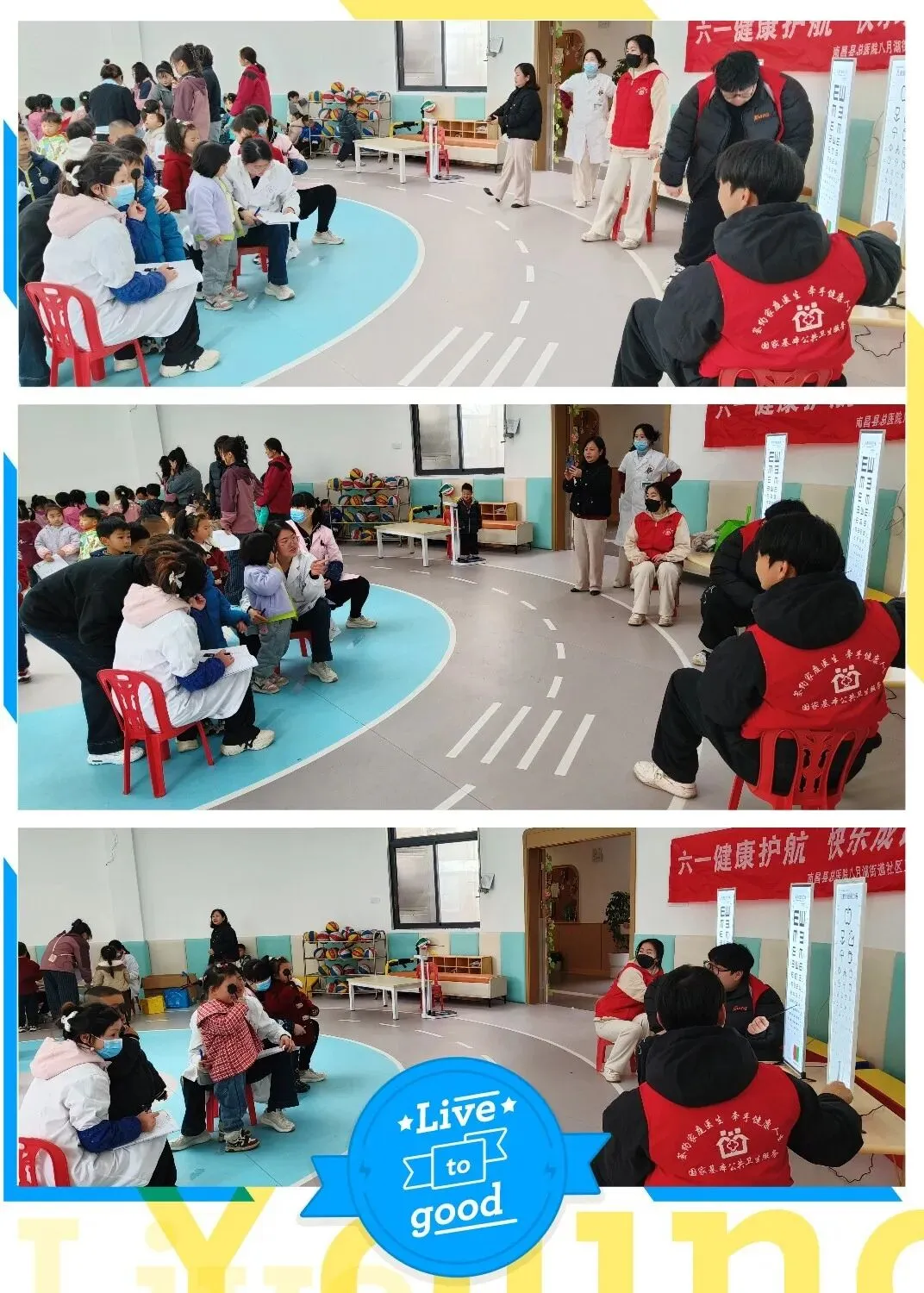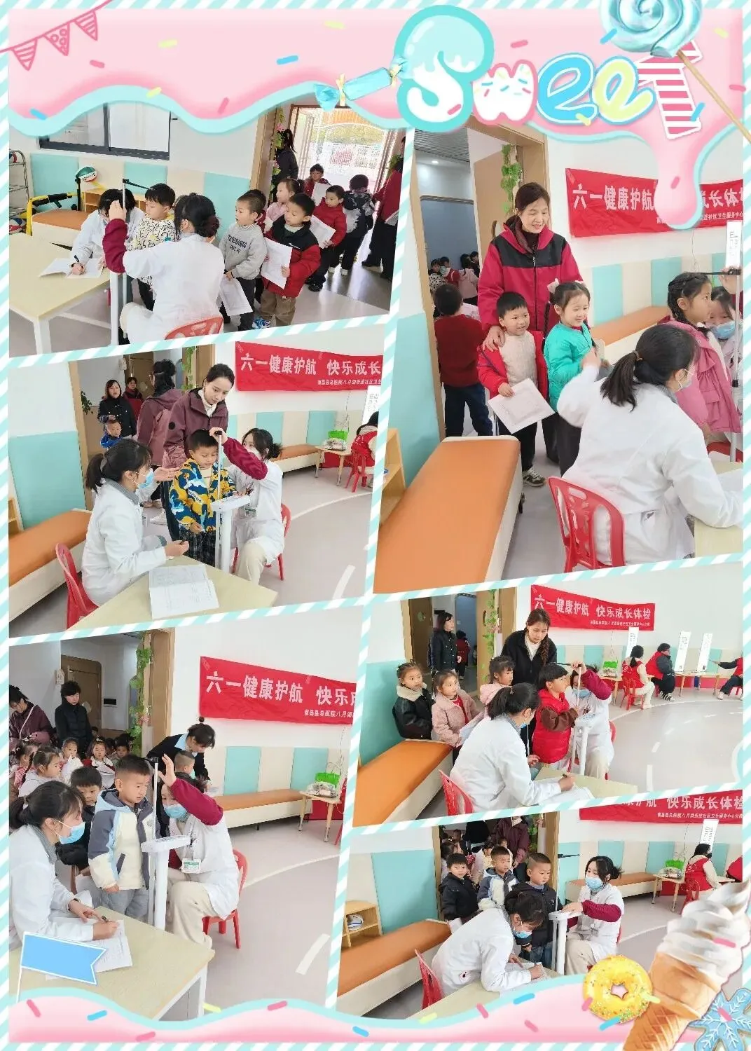体检现场,孩子们在老师的引导下,排着整齐的队伍,手持体检表,依次等待检查;医护人员分工明确、耐心细致,为每位孩子进行身高、体重、视力筛查、口腔检查、心肺听诊及血红蛋白等项目的检测,并认真记录数据。