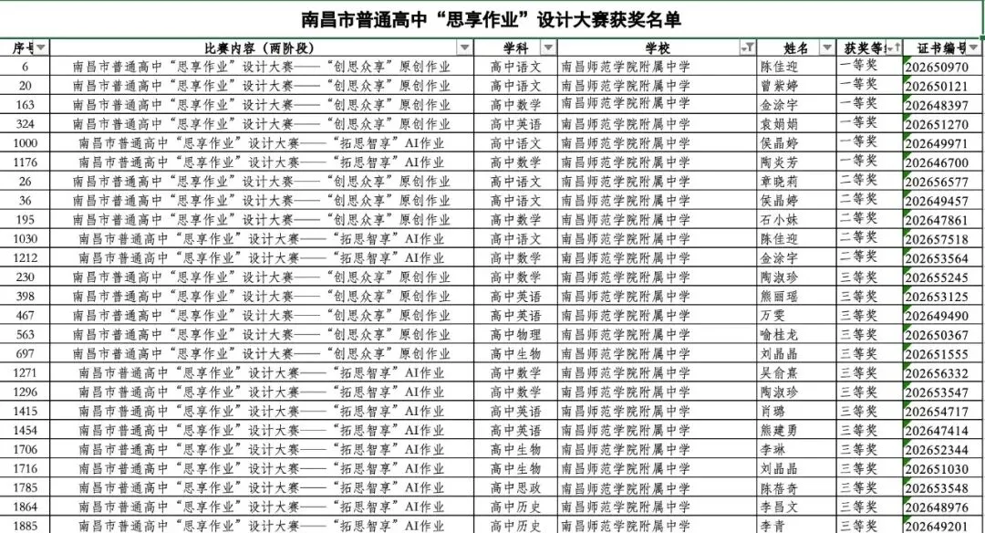 风拂杏坛,墨染书香。在刚刚落幕的南昌市普通高中“思享作业”设计大赛中,我校教师深耕教学、锐意创新,凭借扎实的专业素养与精巧的作业设计,在全市角逐中脱颖而出,斩获一等奖6项、二等奖5项、三等奖14项,展现出我校教师队伍的教研实力与育人智慧。