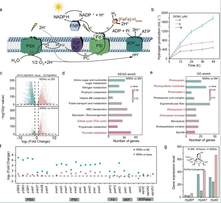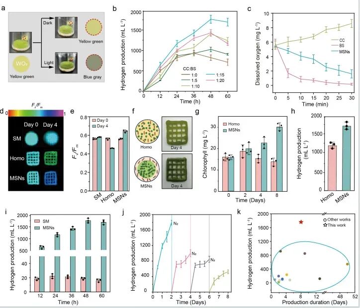 氢能作为一种清洁、高能量密度的可再生能源,被视为未来能源转型的关键。然而,传统制氢方法如化石燃料重整能耗高、碳排放量大,而电解水制氢目前仍面临能耗较高的挑战。生物制氢,尤其是微藻光合制氢,因其直接利用太阳能、环境友好而备受关注。然而,微藻产氢的核心酶——[FeFe]-氢化酶对氧气极为敏感,而光合作用同时产生的氧气会强烈抑制氢化酶活性。如何在微藻产氢过程中有效去除氧气、维持厌氧环境,是当前生物制氢领域亟待解决的关键问题。为解决这一难题,四川大学杜晓声教授、周加境研究员与南昌大学刘进教授联合研究团队开发了一种具有核心-壳层结构的微生物共生水凝胶系统。该系统通过同轴3D打印技术,将产氢微藻莱茵衣藻封装于水凝胶核心,将耗氧细菌枯草芽孢杆菌封装于水凝胶壳层,构建了空间分隔的二元微生物共生网络。该水凝胶由海藻酸钠、卡拉胶和聚乙二醇二丙烯酸酯复合而成,具备良好的机械性能和生物相容性。核心-壳层结构不仅为两种微生物提供了各自优化的生长微环境,还通过壳层细菌的呼吸作用持续消耗氧气,为核心微藻营造局部厌氧条件,从而激活氢化酶、促进氢气高效生成。该系统可在无液体培养基条件下长期运行,显著提高氢气产率并降低水资源消耗。相关成果以Engineered microbial hydrogels with confined architecture and binary microbes for efficient hydrogen production发表在nature communications上。图1 展示了核心-壳层微生物水凝胶的3D打印构建策略与氢气生成机制。微藻位于核心、细菌位于壳层,壳层细菌通过呼吸作用消耗氧气,为核心微藻营造厌氧环境,激活氢化酶,实现高效产氢。图2 展示了MSN系统的结构表征与微生物活性。荧光成像显示微藻与细菌分别定位于核心与壳层区域,且边界清晰。经过14天无液体培养,微藻叶绿素含量持续上升,细菌GFP荧光在初期增强后趋于稳定,表明两种微生物均保持良好的生长状态。图3 系统评估了MSN的氢气生产能力。当莱茵衣藻与枯草芽孢杆菌比例为1:15时,氢气产量达到1763 ± 98 mL H₂ L⁻¹,是传统悬浮培养体系的78倍。核心-壳层结构显著优于均质混合体系,且MSN可在多次氮气吹扫循环中持续产氢8天。图4 通过转录组学解析了MSN系统增强产氢的分子机制。与悬浮培养和均质体系相比,MSN系统中微藻光合作用相关基因(如psbO、psbP、psbQ)及氢化酶相关基因(HydA1、HydEF、HydG)显著上调,表明核心-壳层空间分隔结构优化了光能利用与电子传递效率,激活了氢化酶表达。本研究成功构建了一种基于3D打印的核心-壳层微生物共生水凝胶系统,实现了微藻与细菌的空间分隔与功能协同。壳层细菌通过呼吸作用持续消耗氧气,为核心微藻营造局部厌氧环境,显著提升氢化酶活性与氢气产率。该系统不仅氢气产量高达1763 mL H₂ L⁻¹,远超传统悬浮培养体系,还可在无液体条件下长期稳定运行,大幅降低水资源消耗。该研究为高效、可持续的生物制氢提供了全新平台,也为微生物-材料共生系统的设计开辟了新思路。