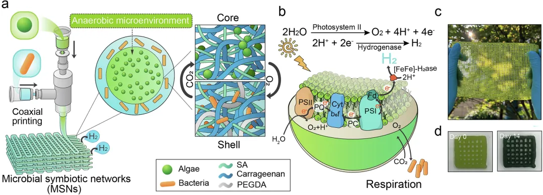 他们利用同轴3D生物打印技术,制造出一种核—壳结构的水凝胶网络: - 核心层:住着微藻 Chlamydomonas reinhardtii(莱茵衣藻),负责光合作用; - 外壳层:包裹着细菌 Bacillus subtilis(枯草芽孢杆菌),专司“吸氧”——通过呼吸作用快速消耗氧气,为内部微藻营造局部厌氧微环境。