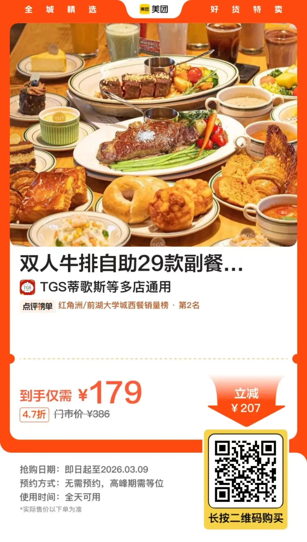 南昌必吃榜西餐厅「TGS蒂歌斯」双人牛排自助+29款副餐无限吃184!