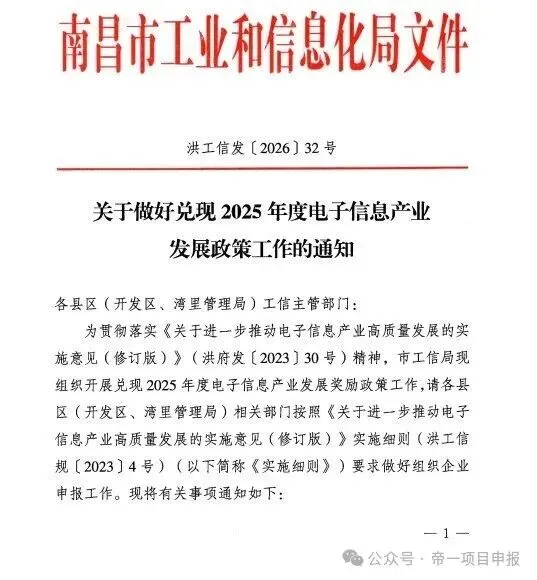 为贯彻落实《关于进一步推动电子信息产业高质量发展的实施意见(修订版)》(洪府发[2023]30号)精神,市工信局现组织开展兑现2025年度电子信息产业发展奖励政策工作,请各县区(开发区、湾里管理局)相关部门按照《关于进一步推动电子信息产业高质量发展的实施意见(修订版)》实施细则(洪工信规[2023]4号)(以下简称《实施细则》)要求做好组织企业申报工作。现将有关事项通知如下。