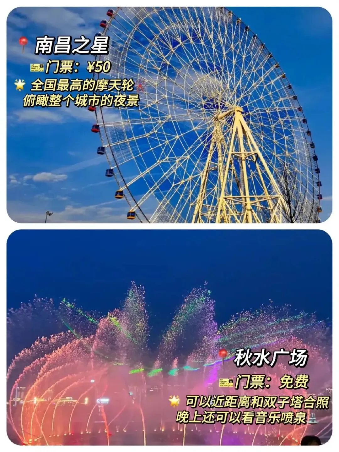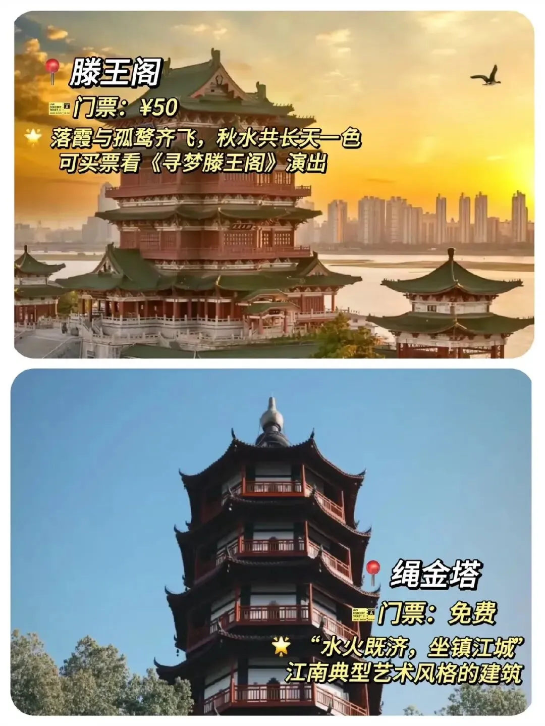 南昌是一座兼具英雄底色与烟火气的城市,对大学生来说性价比超高。景点方面,滕王阁可以打卡 “落霞与孤鹜齐飞” 的诗意,学生票仅 50 元;八一起义纪念馆和江西省博物馆免费开放,能深入了解红色历史与赣鄱文化;万寿宫历史文化街区和绳金塔适合拍国风大片,秋水广场的音乐喷泉和南昌之星摩天轮则是夜晚的浪漫首选。