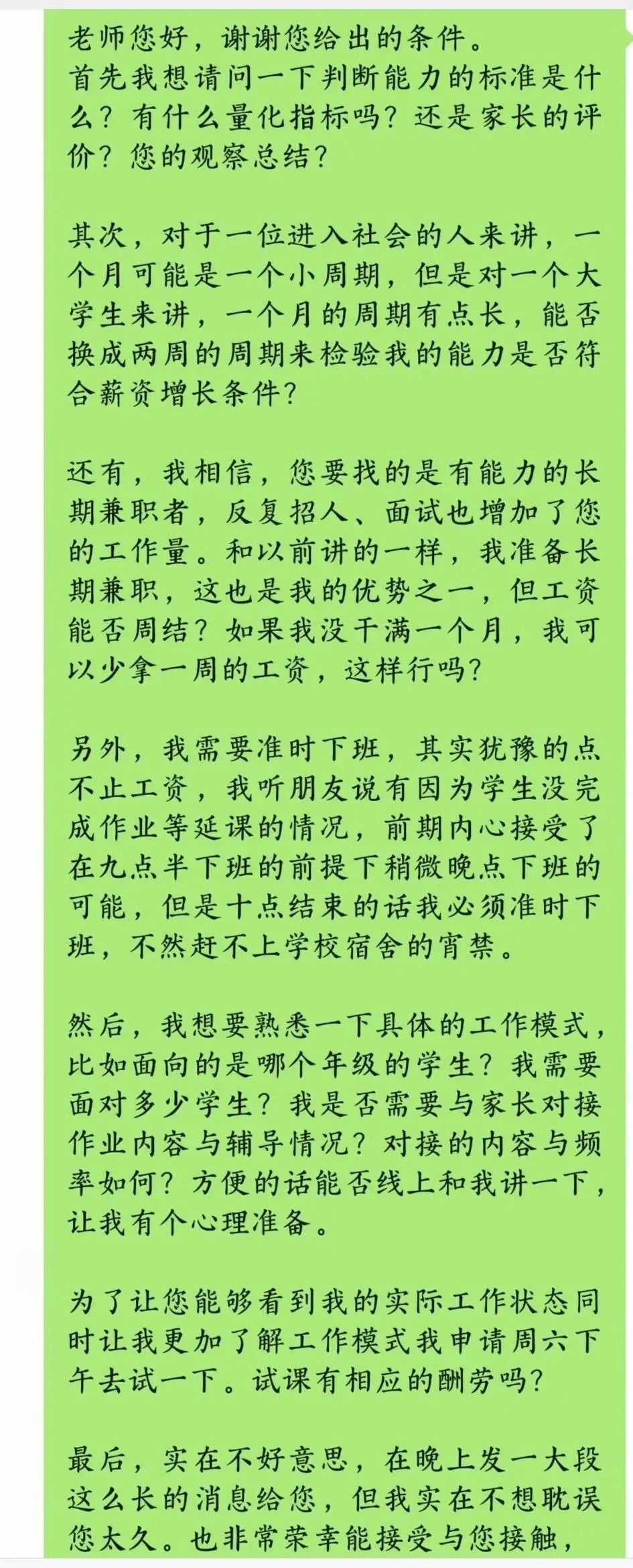 回忆起种种,与我预设的、可以接受的情况大不相同。科目变了,时间变了,可是薪资原封不动,内心的落差促使我有申请加薪的欲望。这似乎对于一个还没有应聘上的人来讲很是致命,但我不想吞下这份委屈。说明的信息不符,放弃晚餐福利后,我申请日薪提高到