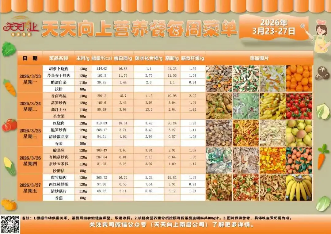 根据《南昌市中小学(幼儿园)配送餐管理办法》和相关精神,现将本校2026年3月23日—2026年3月27日菜谱公示如下: