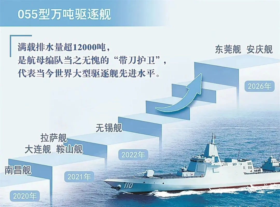 2017年6月28日,中国首艘万吨大驱101“南昌”舰在上海江南造船厂下水,2020年1月12日正式服役。 055型驱逐舰在中国海军发展历程中具有重要的标志性意义,是人民海军有史以来吨位最大、技术最先进、综合作战能力最强的驱逐舰。自南昌舰入列以来,055型导弹驱逐舰家族不断壮大。