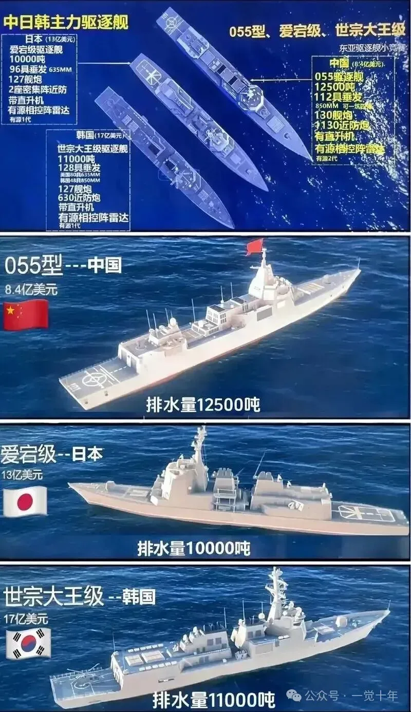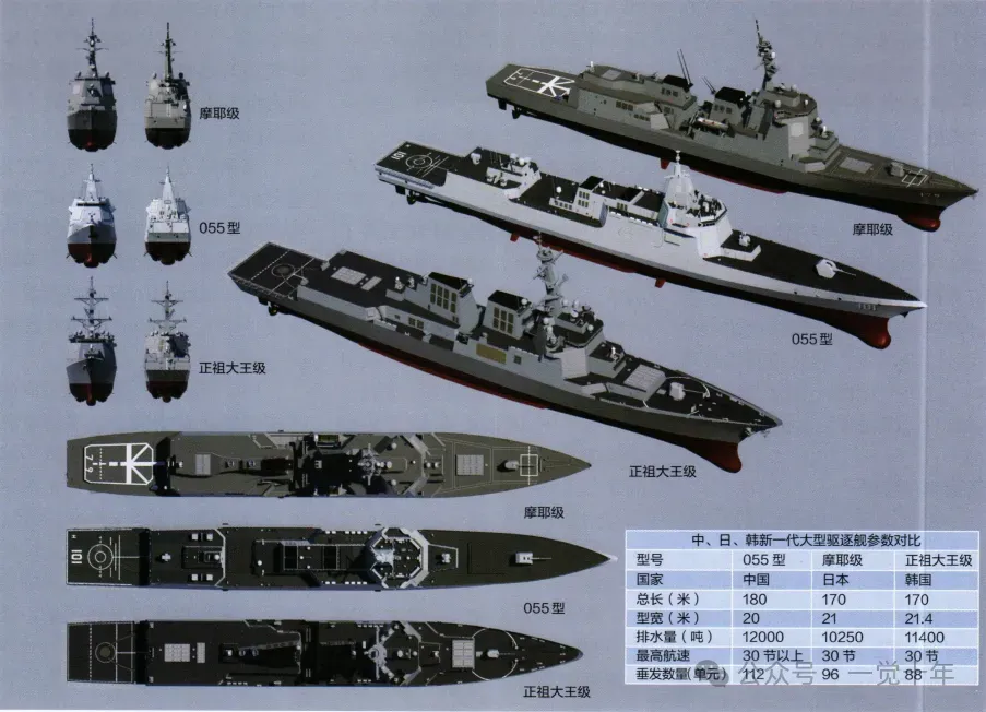 当年下水的新型万吨驱逐舰,给人最为直观地感受就是一个“大”字。这个字的背后涵义深邃。该舰是有史以来中国人民解放军海军除航母、两攻外,最大吨位的主战水面舰艇,也是目前世界上最大吨位的驱逐舰之一:其满载排水量不但将052D远远地甩在身后,而且超过美国的“提康德罗加”级巡洋舰、韩国的KDX-3“世宗大王”级驱逐舰、日本的“爱宕”级驱逐舰以及俄罗斯的“光荣”级巡洋舰,与DDG-1000“朱姆沃尔特”级驱逐舰相差不大。
