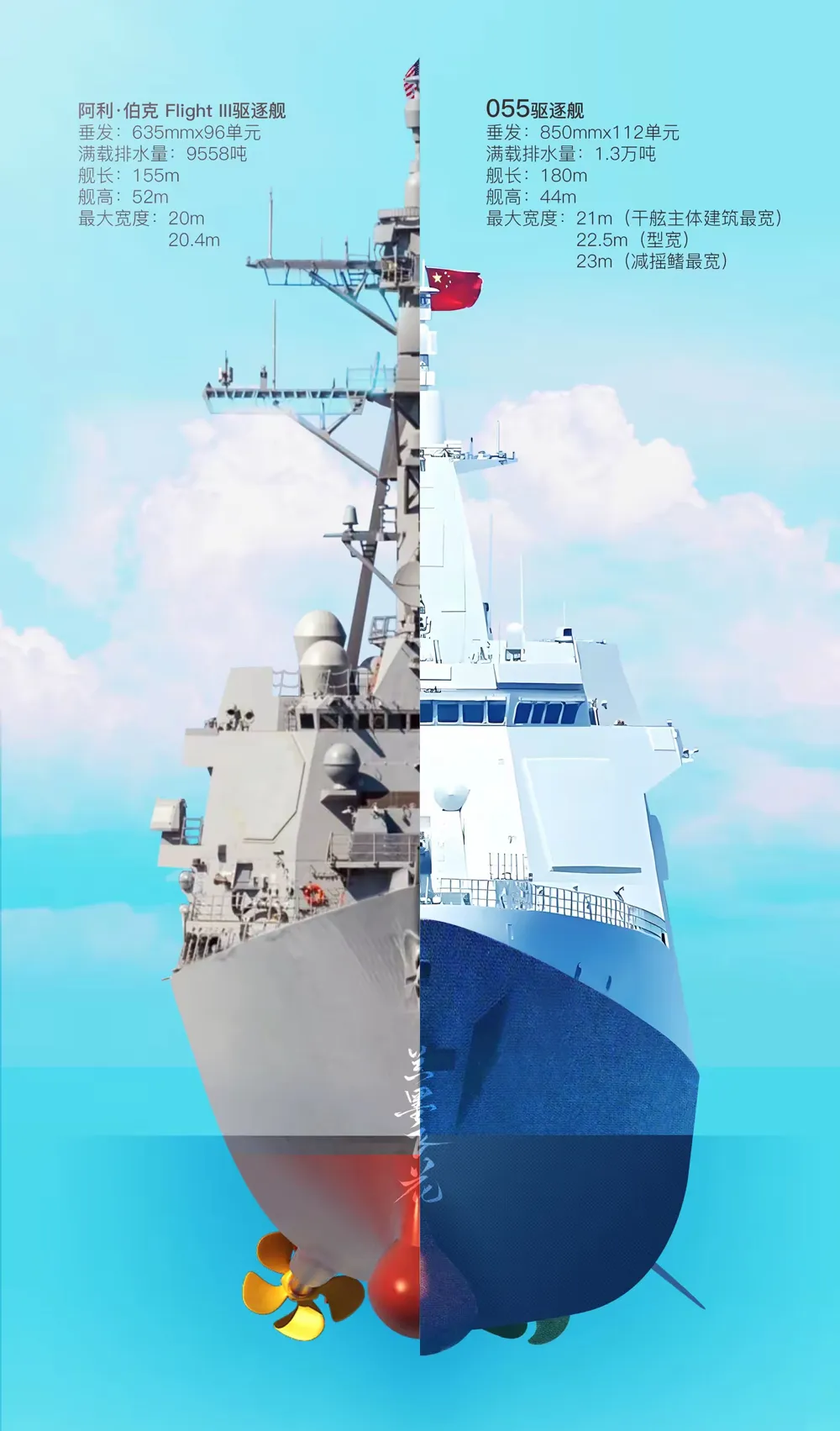 以美国最著名的“宙斯盾”驱逐舰“阿利·伯克”级为例,从1991年首舰“阿利·伯克”号下水算起至今已有近30年了,“阿利·伯克”级为了适应时代发展,不断融合新兴技术,在原型舰的基础上先后发展了Flight I、Flight IA、Flight Ⅱ、FlightⅡA、FlightⅢ等多种型号,在上层结构、防护能力、武器装备、软件系统等各方面都有了巨大的更新,其最新型的FlightⅢ型相对原型舰可以说有了脱胎换骨的变化。以此比之,大驱之“大”不仅“大”在当前,更是“大”在今后。