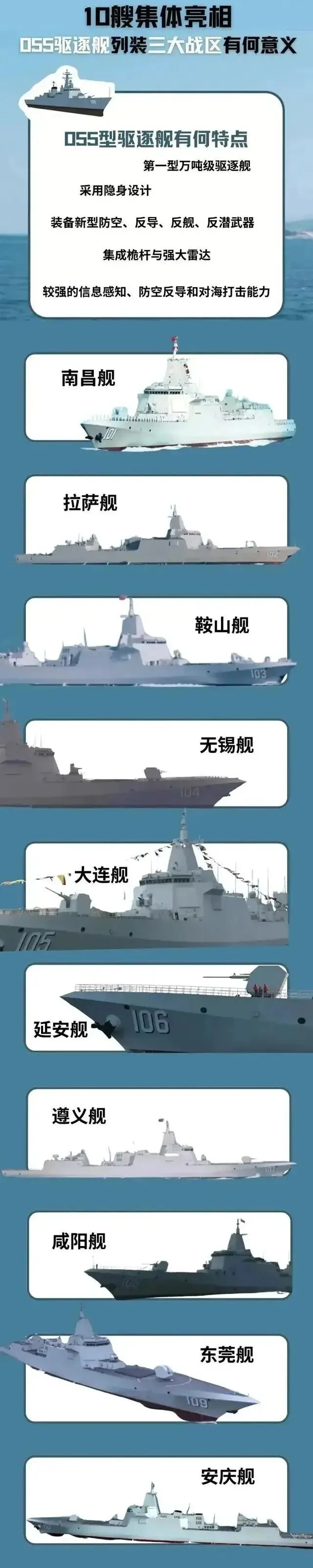 从101南昌舰的横空出世,到如今110安庆舰的驰骋东海,短短6年间,中国海军055型万吨大驱家族已壮大至10艘规模,实现了三大战区的全域覆盖。今天就聊聊055型首舰101“南昌”舰。