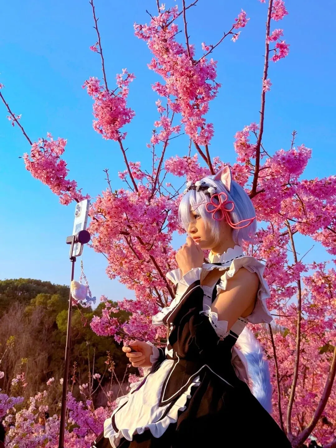3. 樱花林深处:站在花树中间拍特写,温柔感直接拉满