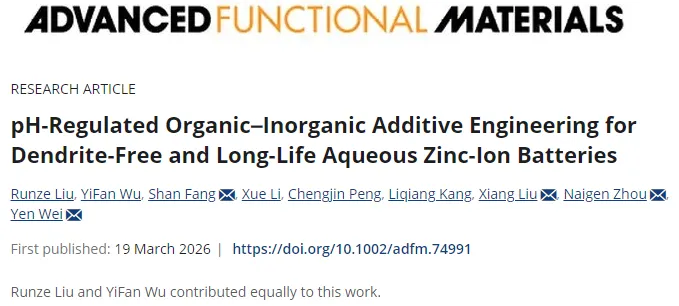 pH-Regulated Organic–Inorganic Additive Engineering for Dendrite-Free and Long-Life Aqueous Zinc-Ion Batteries, Advanced Functional Materials, 2026, https://doi.org/10.1002/adfm.74991