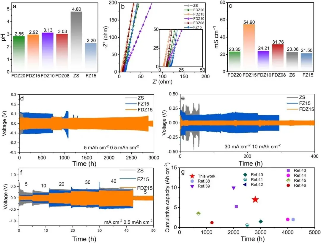 Zn||Zn对称电池测试显示,FDZ15在5 mA cm−2下可稳定循环2800 h,远超对照组,在大电流下也展现出更低的极化电压和更长的循环稳定性,综合性能优于多数已报道体系。